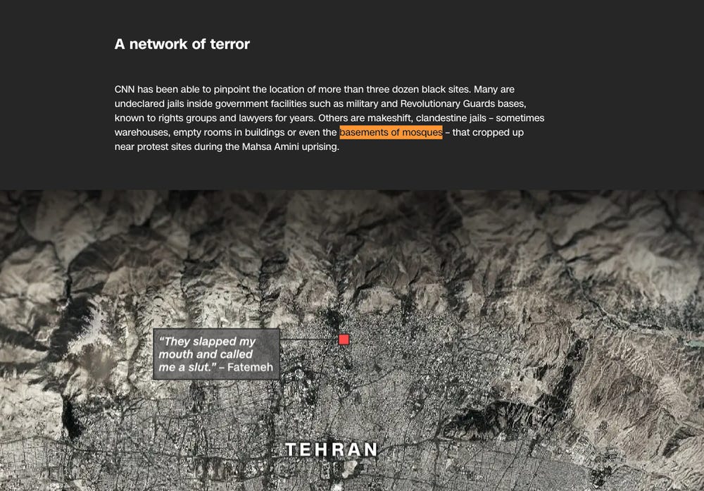 Screenshot from a CNN investigative report on Iran, highlighting the use of mosques as sites for detention and protest suppression.
